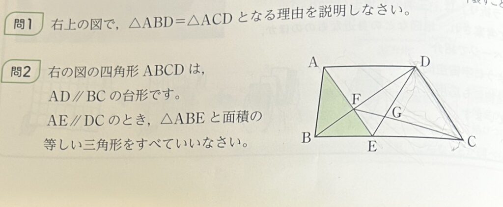 内容は、中学生の定期テストや入試でもよく出てくる 「等積変形」の図形問題です。