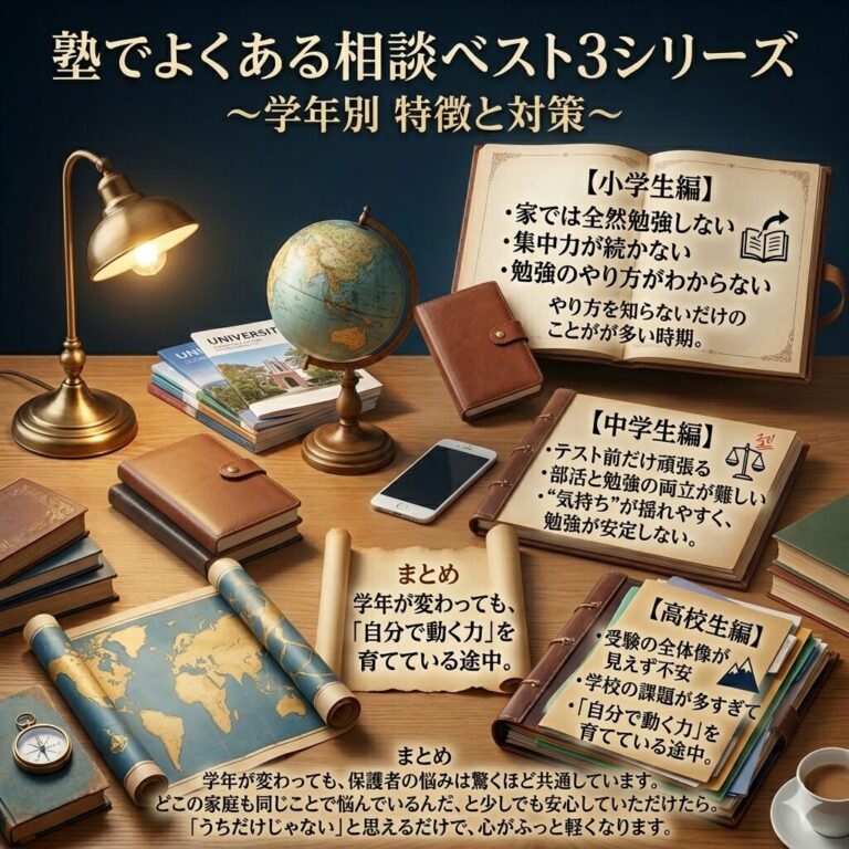 塾では、 ・課題の“やる順番” ・“最短で終わらせる方法” ・“本当に必要な復習”の選別 をサポートし、時間の使い方を整えます。